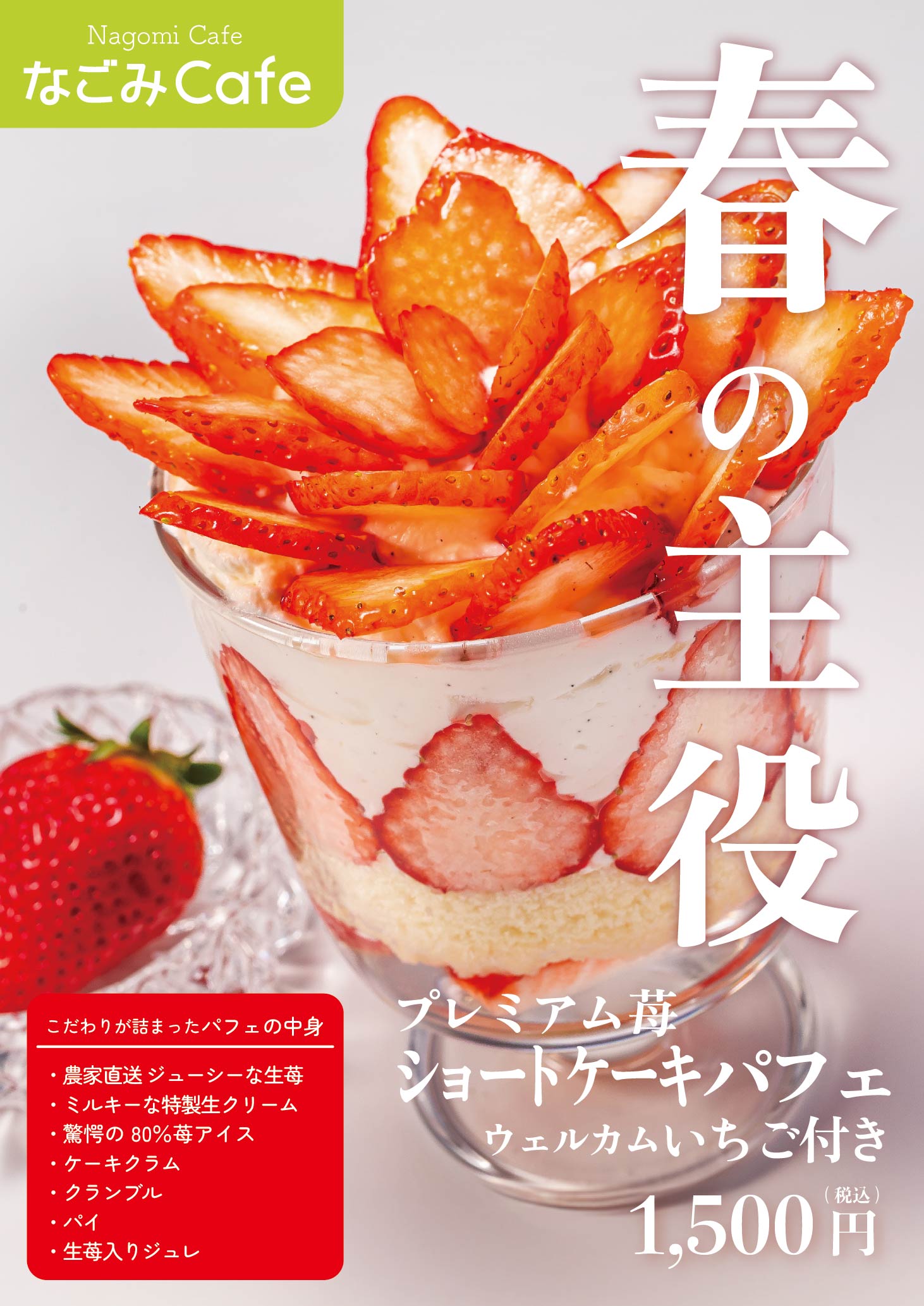 全部で6粒!なごみ自慢の生クリーム、特製ジュレ、ケーキクラム、クランブル、パイ、苺80%アイスが入った春限定パフェ。ウェルカム苺付き!