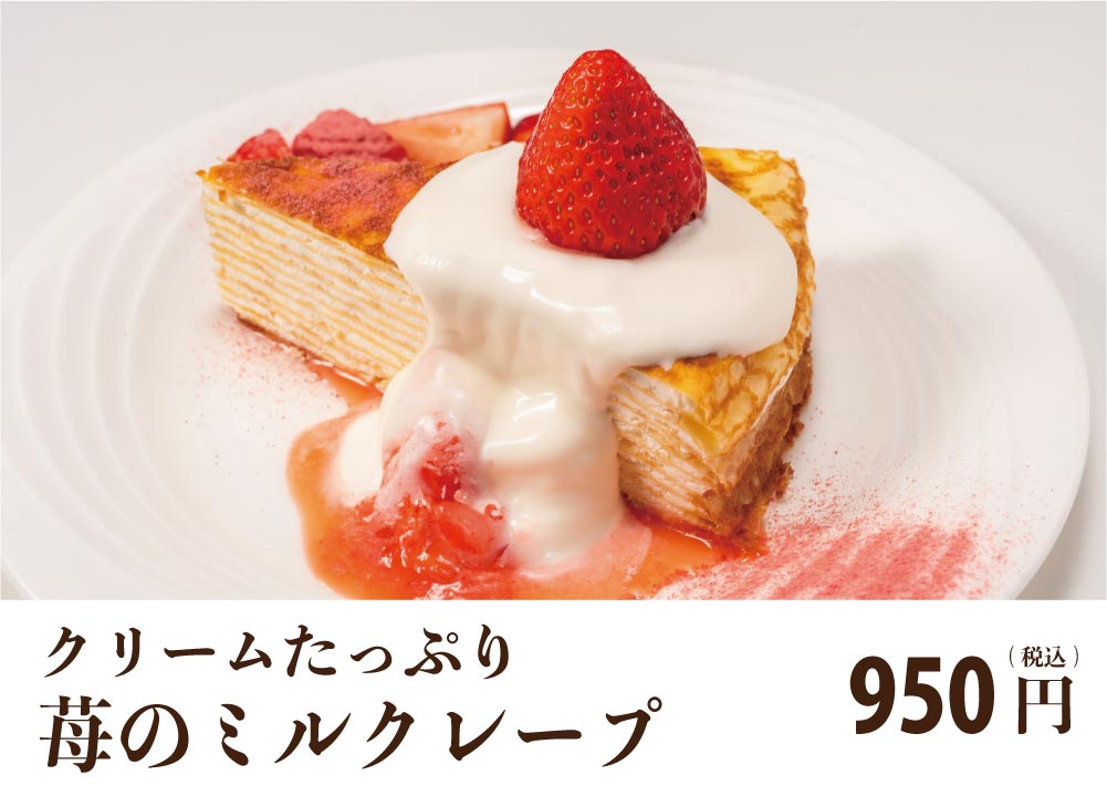 12層にサンドしたミルクレープにたっぷり特製生クリームと苺を添えてゴージャスに!