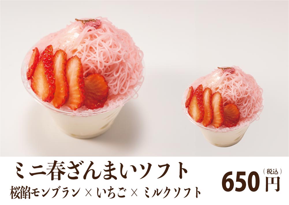 淡いピンクの桜あんモンブランに苺をトッピングした春の新作、限定ミニソフト。