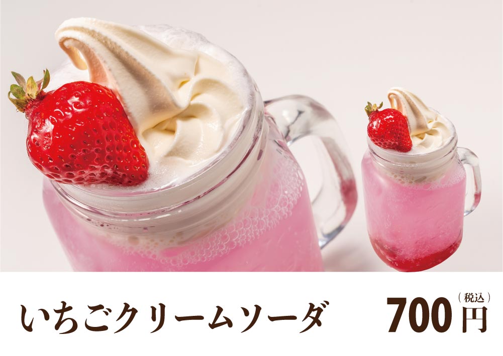 しゅわしゅわソーダ弾ける♪懐かしの苺味のクリームソーダ。苺トッピングで可愛さも満点。