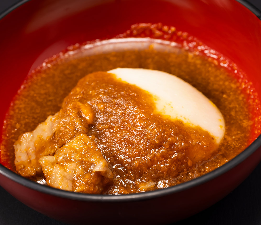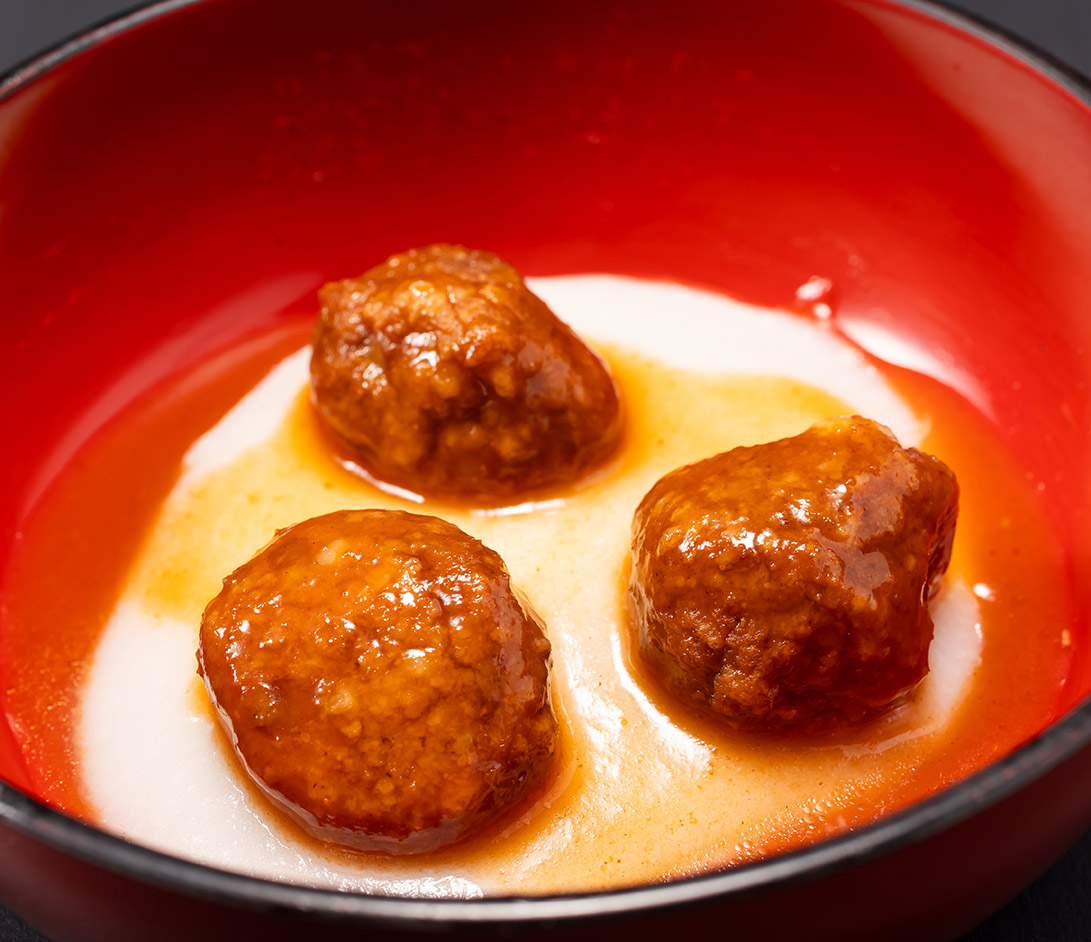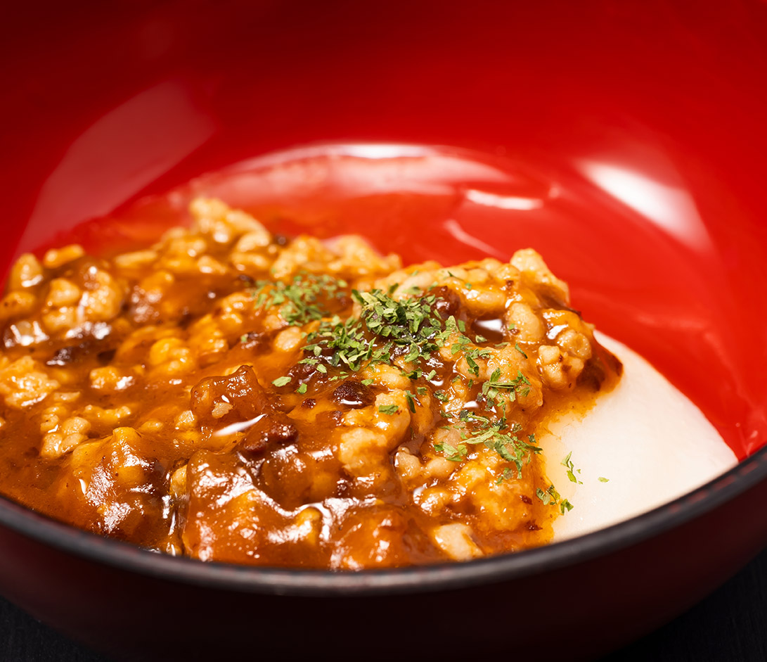 味わい深いコトコト煮込んだ特製トマト煮をまとった餅。トマト好きさん是非!