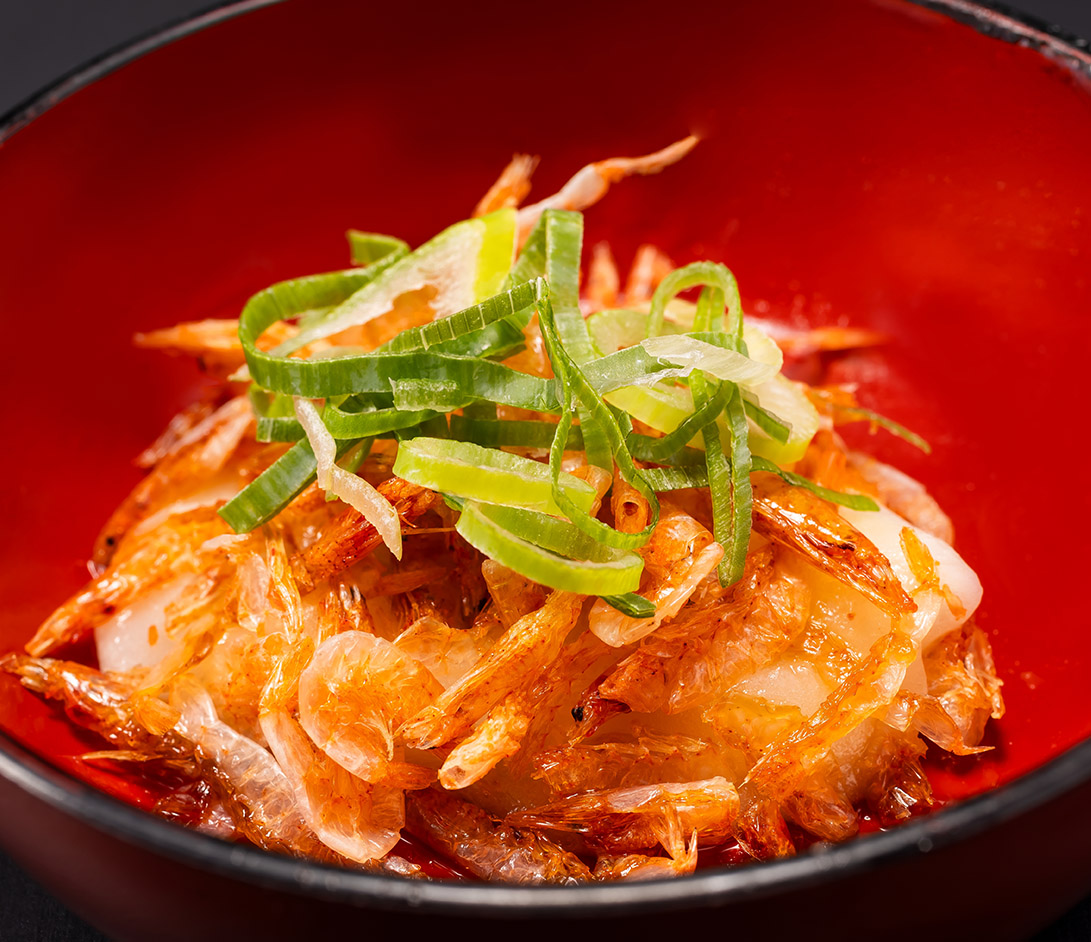 炒めた干しエビを絡めた紅白で縁起の良いお餅。カルシウムたっぷり!