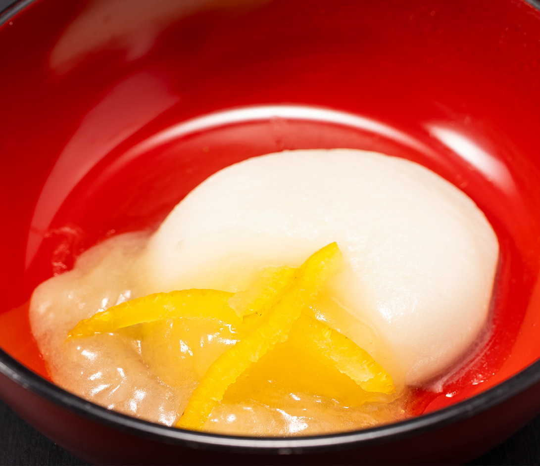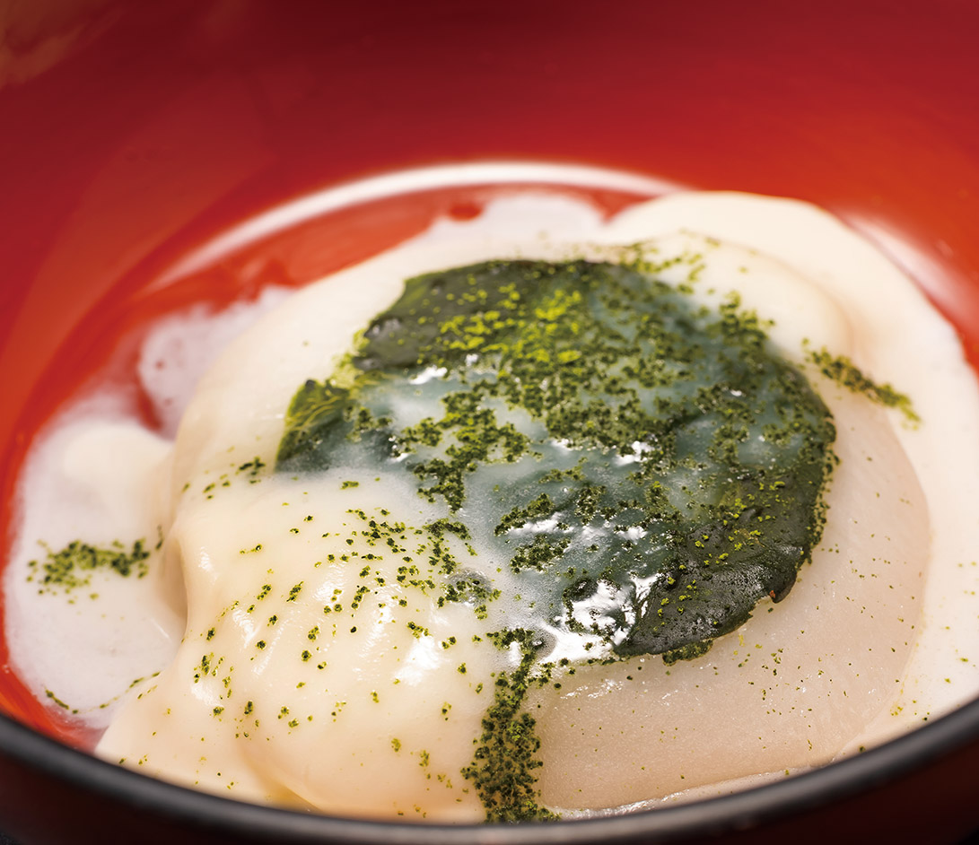 まいこ金時のホクホクとした優しい甘さ感じるポタージュがけ餅!