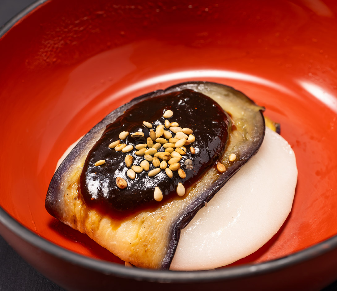 茄子を餅で巻いて、濃厚で甘じょっぱい味わいの田楽みそをかけた特製餅!