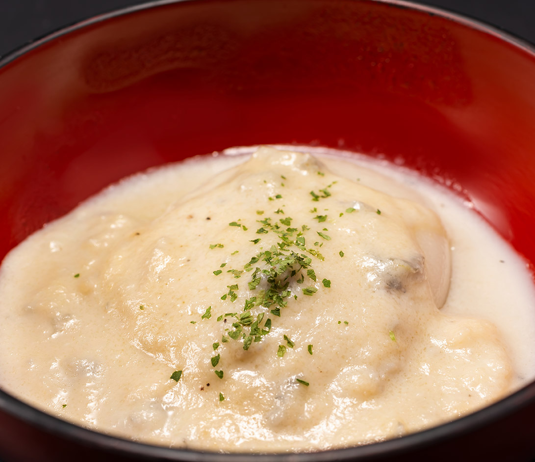 美山牛乳入りの濃厚クリーミーなクリームシチューに餅が合う!