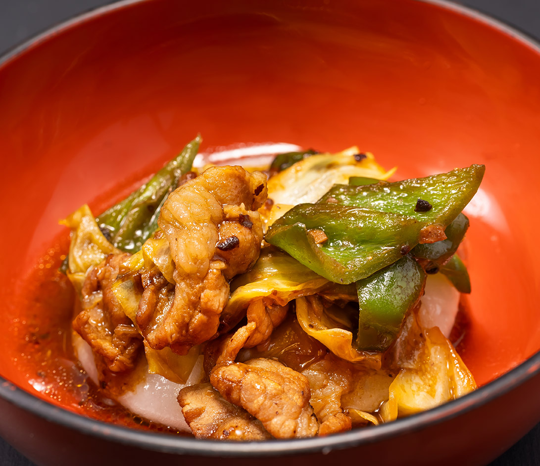 定番中華ホイコーロー×餅。甜麺醤をベースにしたコクのある味わいに合う。