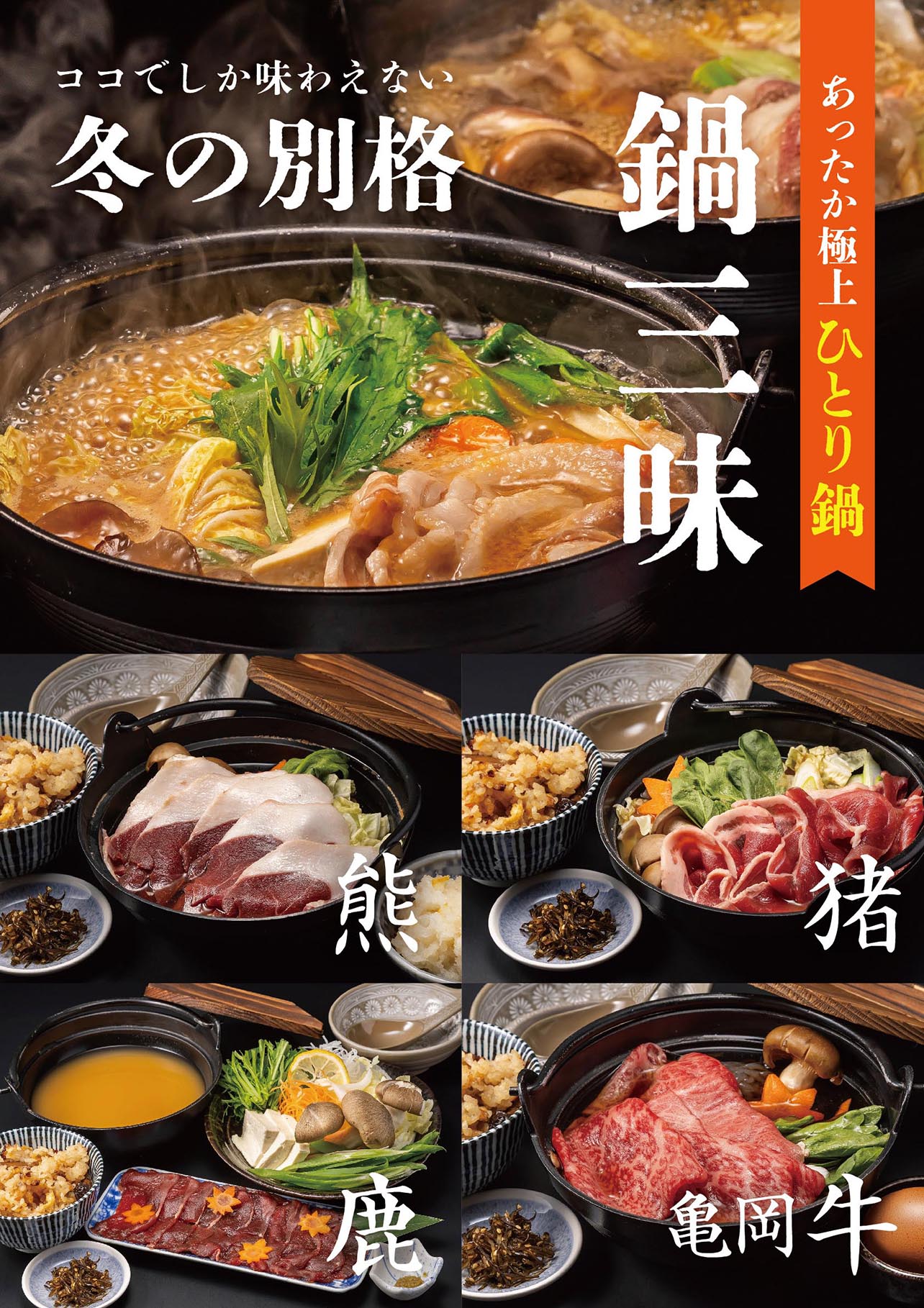 冬の新定番!猪・鹿・熊・亀岡牛のひとり鍋!