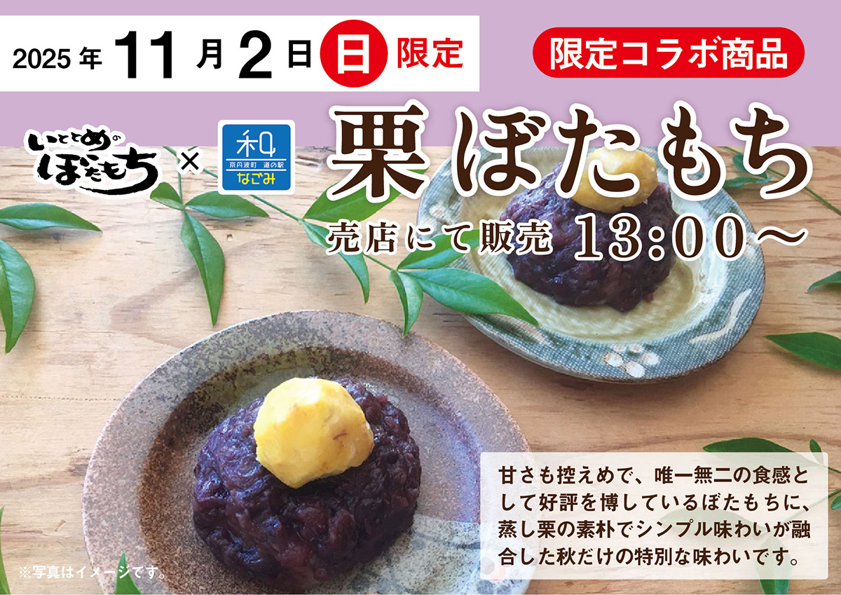 いととめ×道の駅 和のコラボ企画として、大人気の「いととめのぼたもち」に国産蒸し栗をトッピングした特製「栗ぼたもち」の販売をいたします。