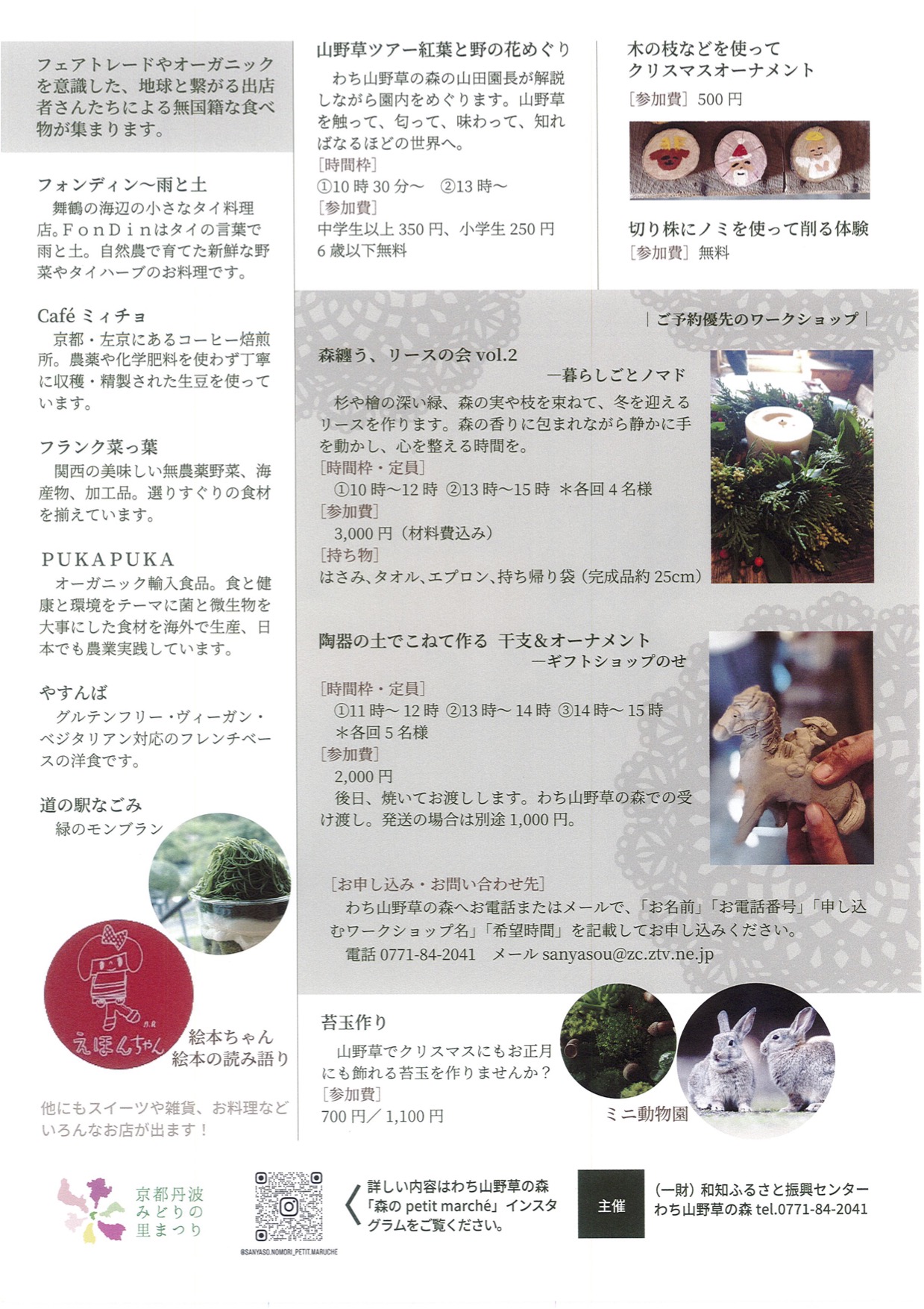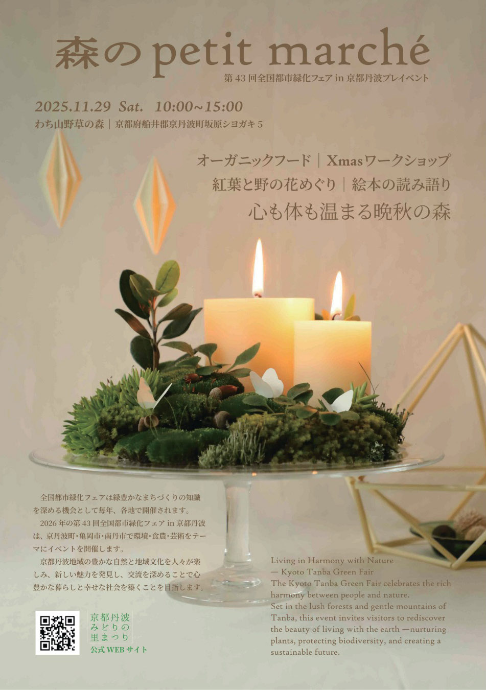 京丹波地域の豊かな自然と地域文化を人々が楽しみ、新しい魅力を発見し、交流を深めることで心豊かな暮らしと幸せな社会を築くことを目指す「第43回 全国都市緑化フェア」の1年前イベントとして、今回「森のpetit marché(プチマルシェ)」が開催されます。